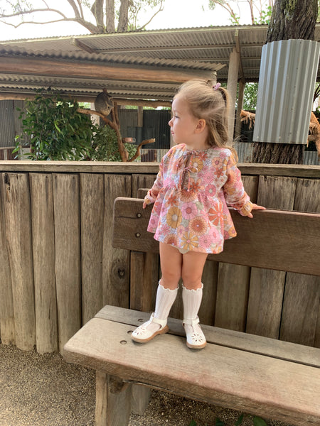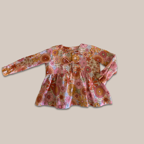 Beautiful blouse with a gathered skirt, long sleeves with gathered ruffled cuffs and unique front ties.
